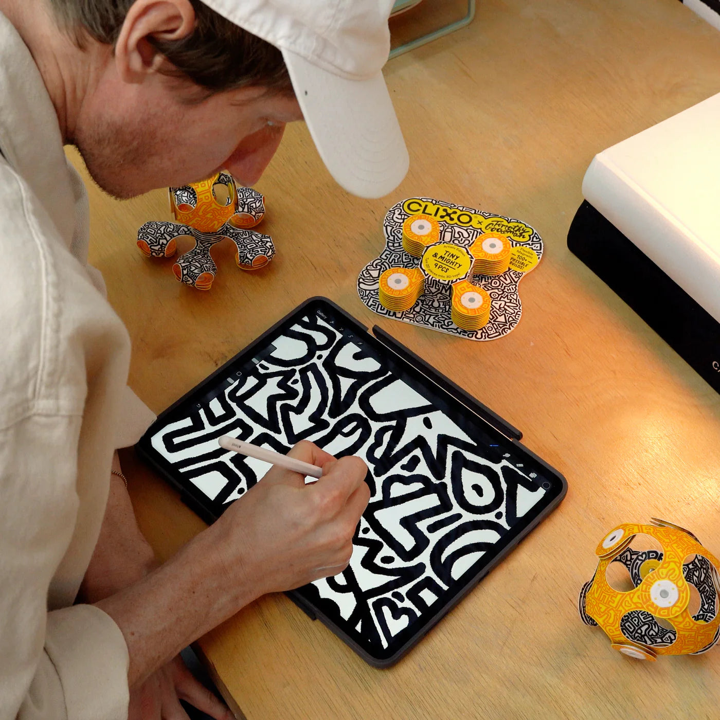 Timothy’s bold, hand-drawn style—famous for its playful doodles and fluid typography—is infused into every piece. He designs with purpose: “One of my core missions is to create work that is both accessible and engaging for children and communities”—art that’s simple to enjoy yet rich in personality. Whether crafting a crown, a snake, or your own imaginative structure, this Artist Edition inspires creative confidence with style.A bit about the artist: Timothy Goodman is an award-winning illustrator, muralist, author, and designer whose art spans public murals, branding, fashion, books, and more. He’s created over 250 murals, designed a Nike sneaker for Kevin Durant, and co-created cultural touchstones like 40 Days of DatingHis signature black-and-white linework, infused with vibrant text and emotion, explores powerful themes—mental health, love, heartbreak, identity—making every piece feel deeply human Timothy’s process pours heart into every stroke: he embraces creativity through “play,” letting ideas evolve from fast, free marker sketches into designs that connect emotionally with audiences.Collaborating with Clixo, his artwork keeps that same energy and authenticity—suitable for ages 3 to 99, and perfect whether you’re at home or on the go.