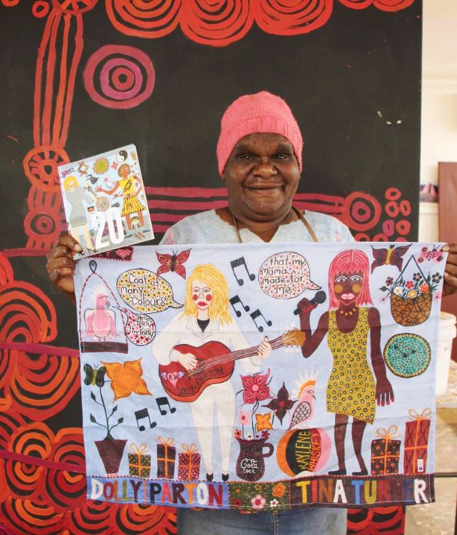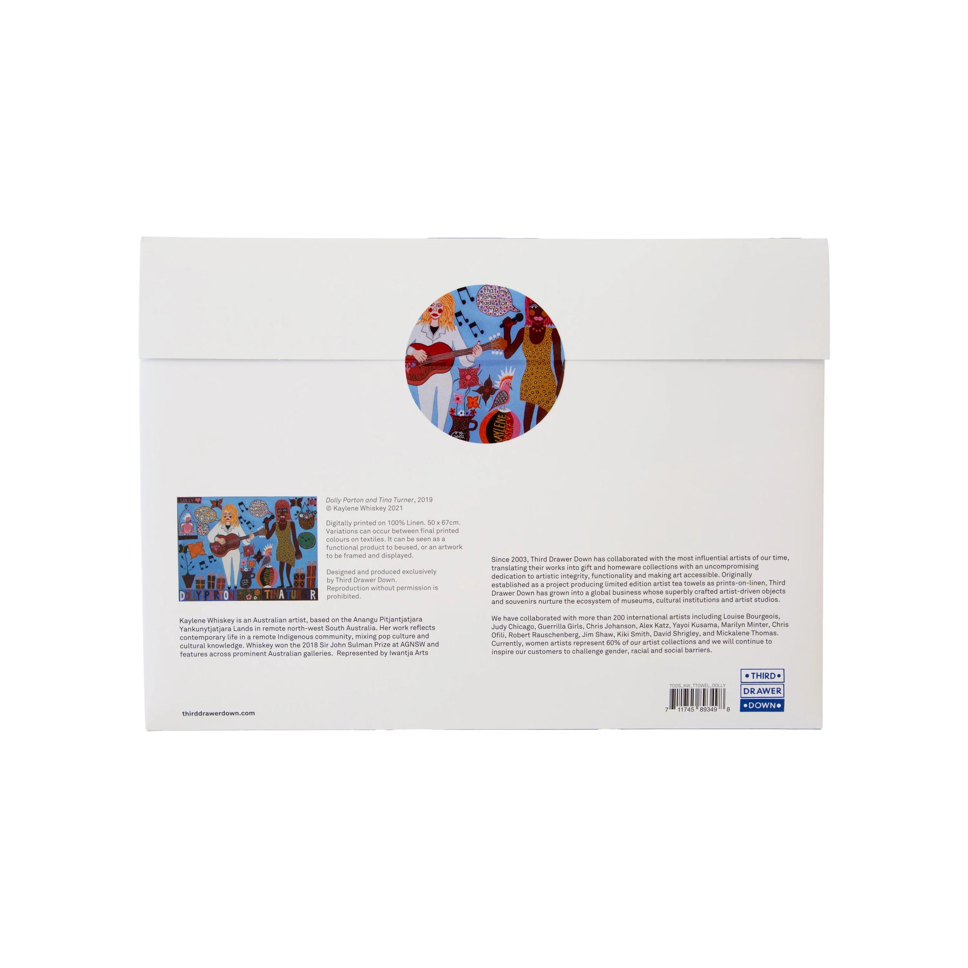 Turn up the volume in your kitchen with this bold and joyful tea towel, featuring Dolly Parton and Tina Turner (2019) by the incredible Kaylene Whiskey. Created in collaboration between Third Drawer Down and Iwantja Arts, this piece transforms a humble household item into a canvas of celebration, pop culture, and sisterhood.