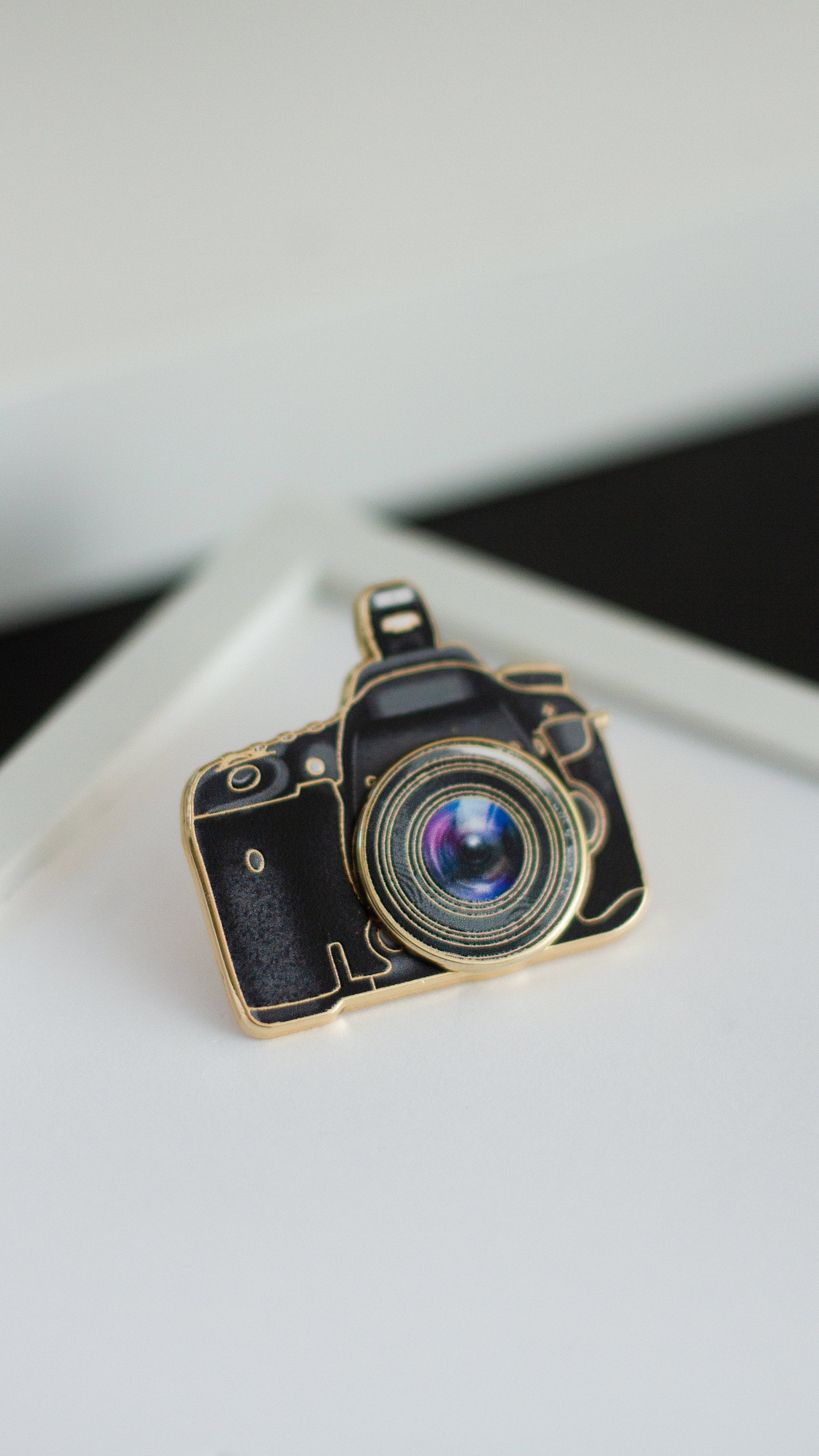 Crafted with care, the pin features a sleek black DSLR camera design complete with an interactive spinning lens that adds playful charm to its detailed look. Finished with premium gold plating and measuring 1.3" wide, it’s the perfect size to stand out on your jacket, bag, or enamel pin collection. Double pin posts with durable black rubber backs keep it secure, and for extra hold, you can upgrade to deluxe or magnetic locking backs. Each pin comes beautifully presented on a branded backing card, ready to gift or collect.