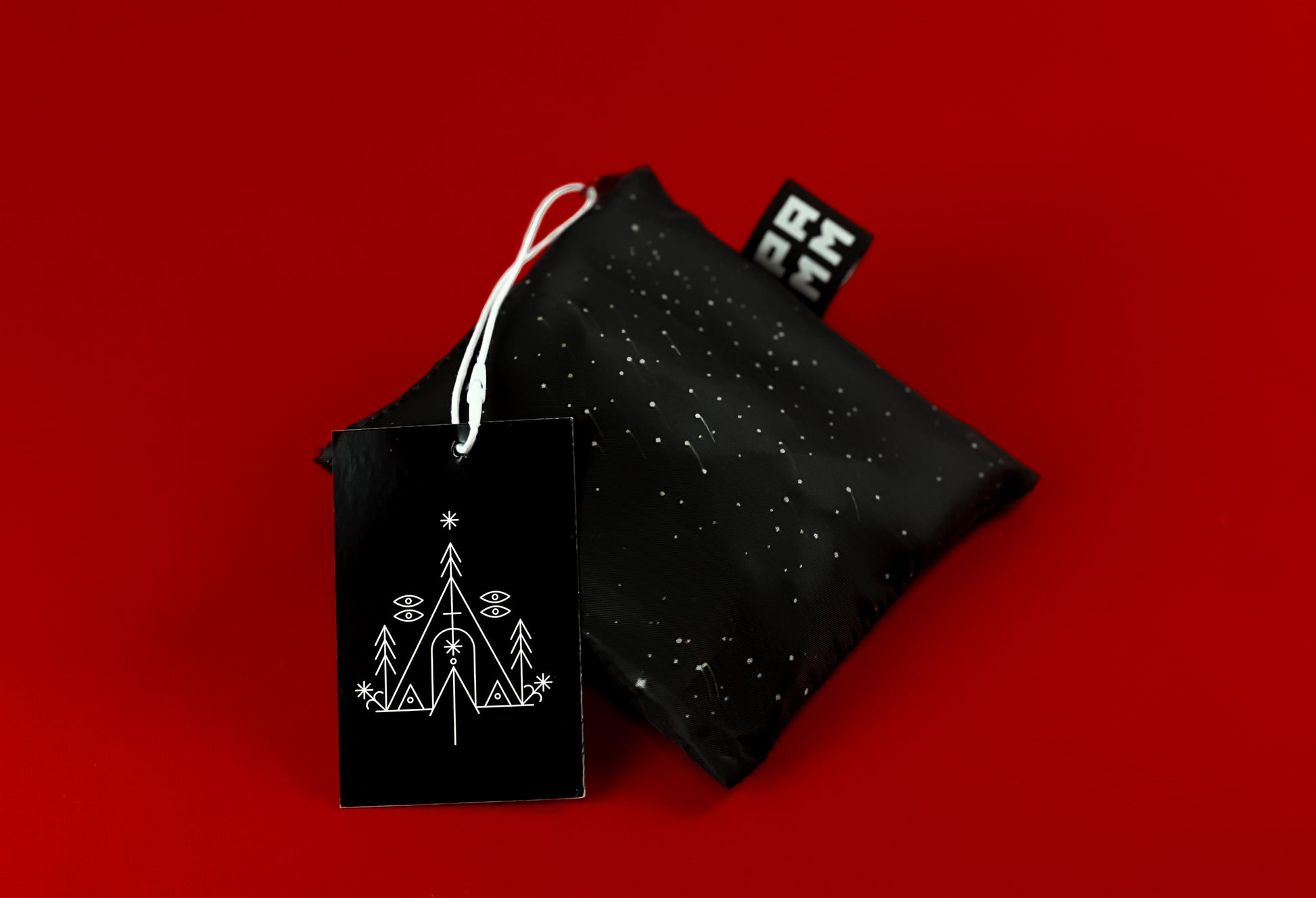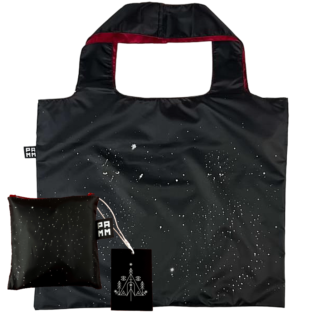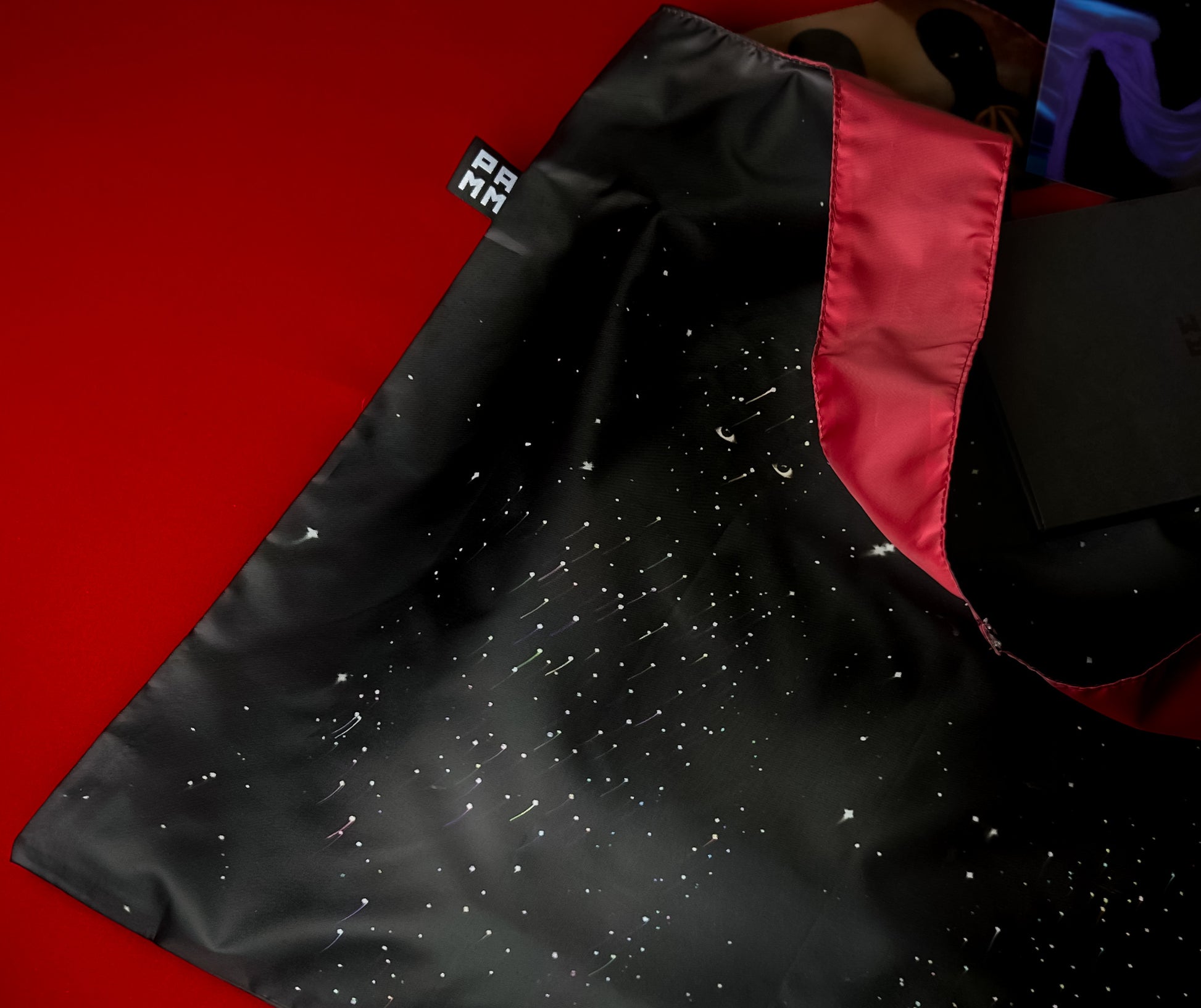 Crafted with intention and sustainability in mind, the tote is made of 100% RPET Recycled 190T Polyester, reducing environmental impact while maintaining durability. Measuring 19" wide by 25" high in its flat style, it features an inner handle lining for comfort and strength. The design is custom printed on both the front and back, and each tote carries a custom woven PAMM logo label on both the bag and the pouch. Inside, a striking red interior lining adds a bold flash of color—a hidden detail that makes the bag as stylish on the inside as it is on the outside. The tote folds neatly into a 4.5" custom pouch with a matching zipper, making it practical to carry and store. Whether slipped into a backpack, suitcase, or car, it’s ready whenever you need it—transforming an ordinary accessory into a portable talisman of ritual and design.