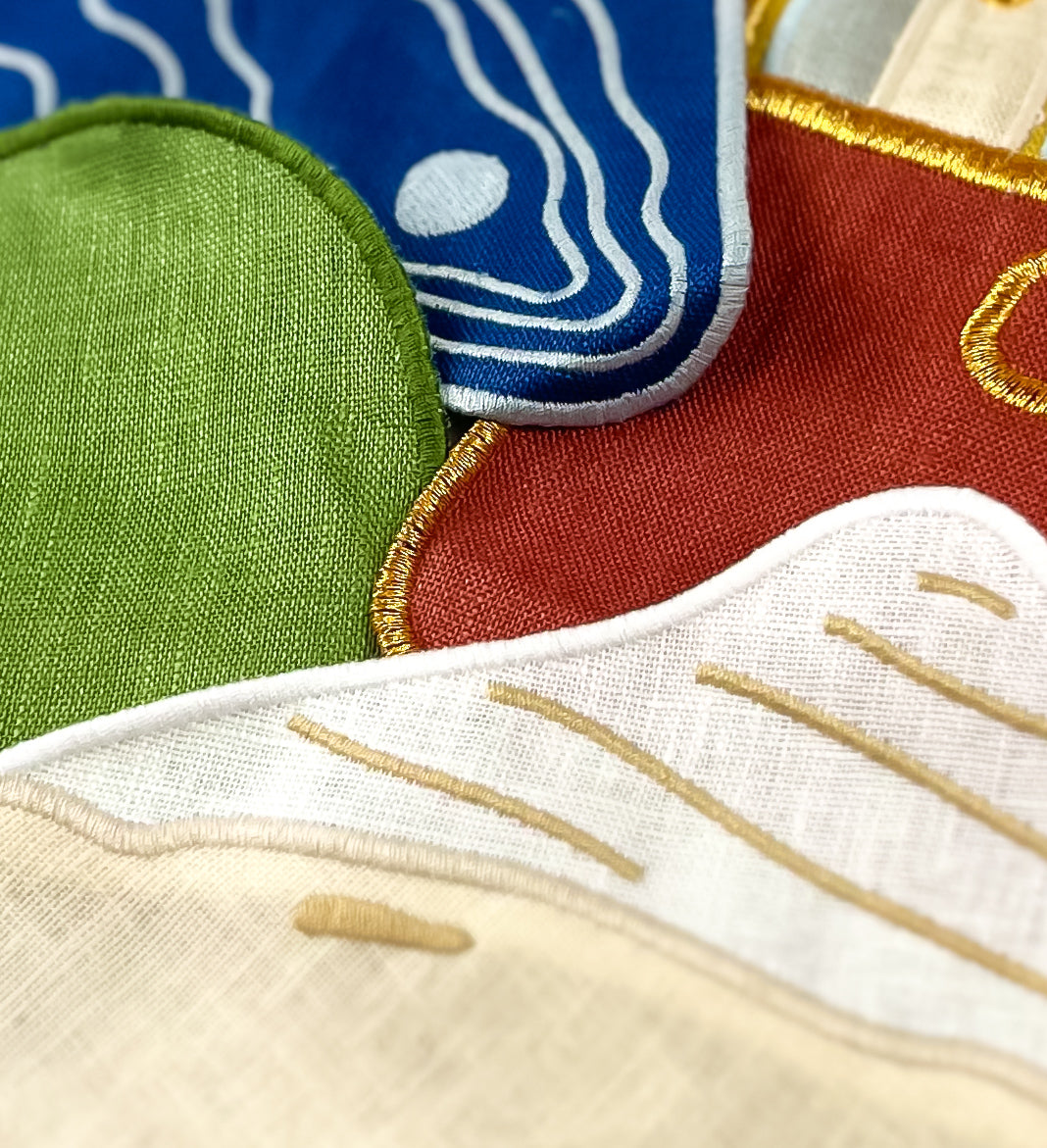 Happy hour just got a gourmet upgrade. The Hors D’oeuvres Cocktail Napkins celebrate the art of snacking in style — featuring an olive, a sardine tin, an oyster, and a gloriously stinky wedge of cheese, all delicately embroidered on 100% linen.