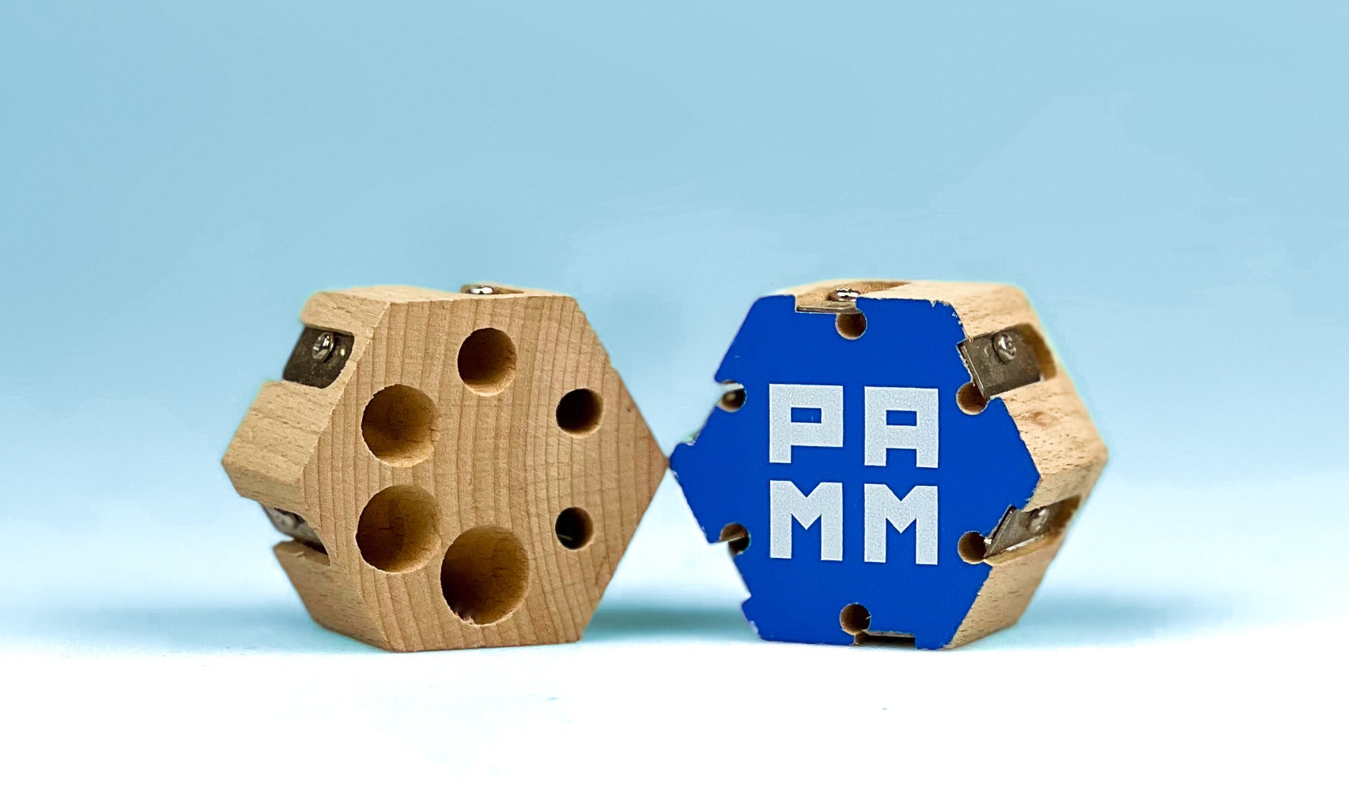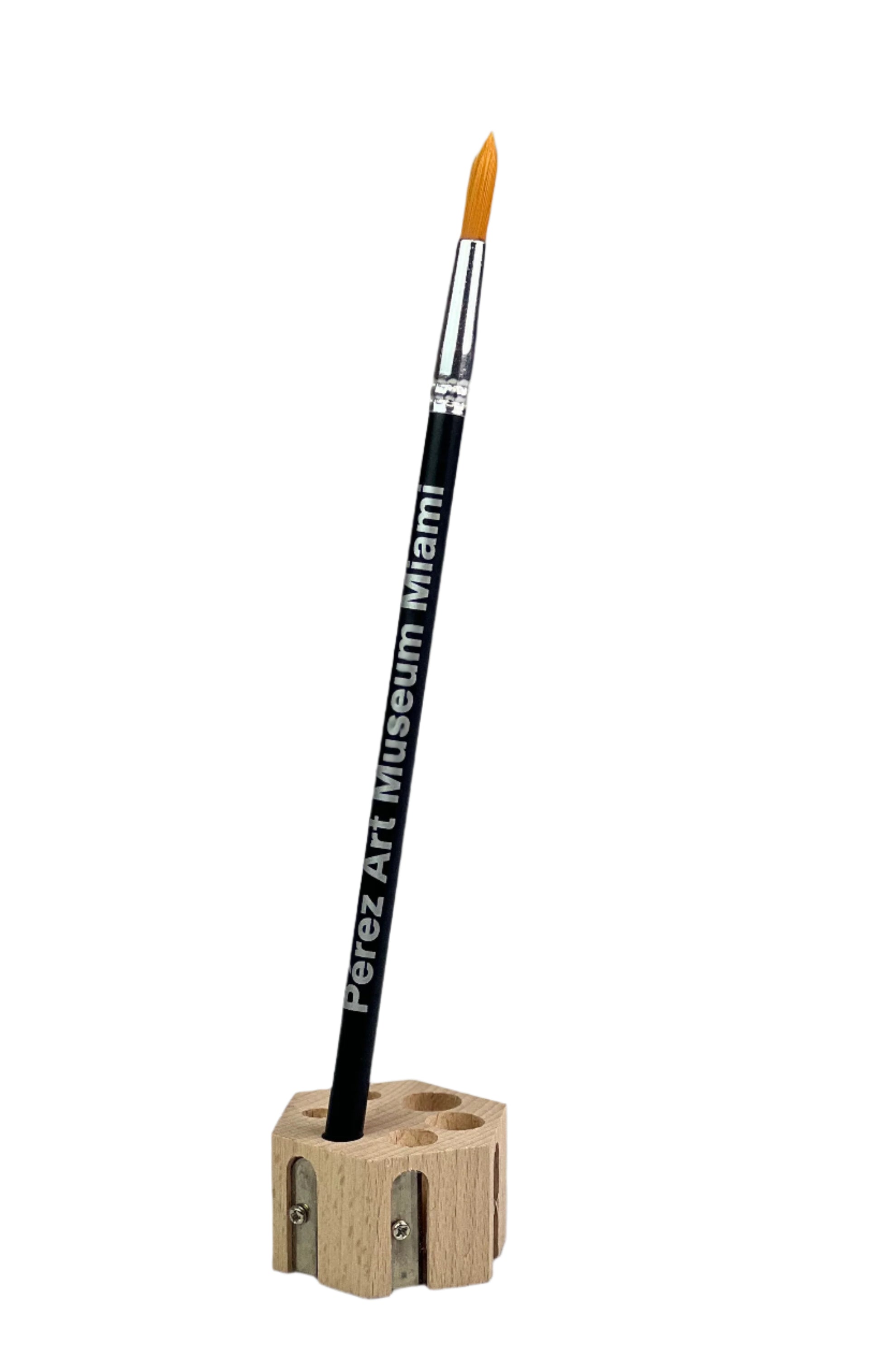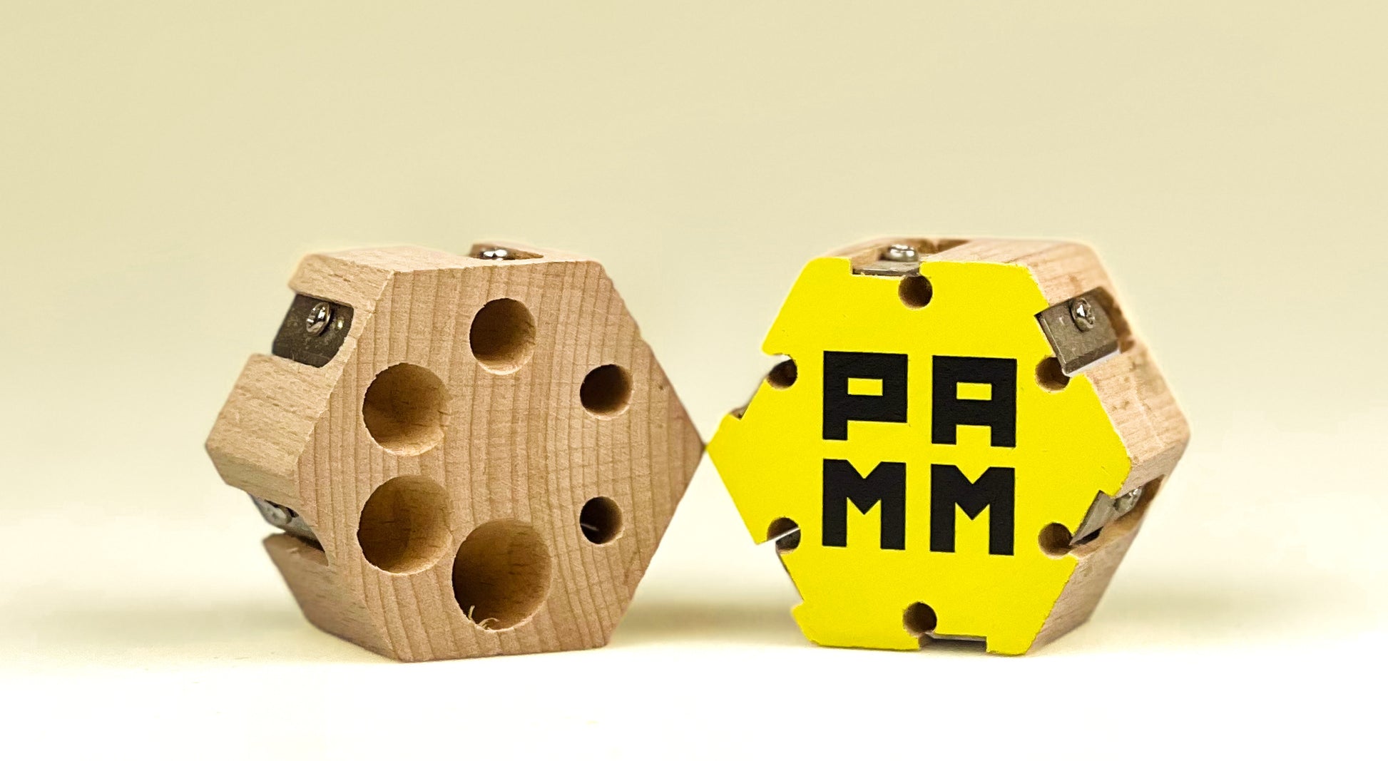 Say hello to the boldest pencil sharpener in the game — the PAMM Hexagon Sharpener, inspired by the creative spirit of Pérez Art Museum Miami! Whether you're sketching, doodling, or writing your next masterpiece, this 6-hole wooden sharpener turns a simple tool into a statement. Crafted with smooth natural wood and topped with bright, eye-catching enamel faces stamped with our iconic PAMM logo, this sharpener isn't just functional — it’s museum-worthy.
