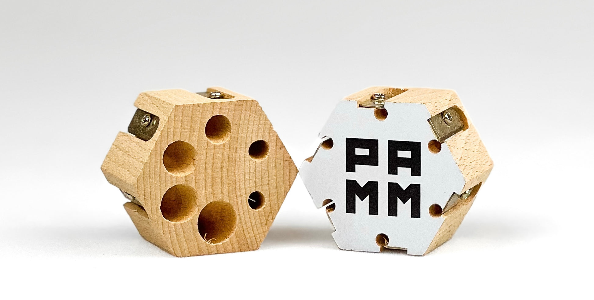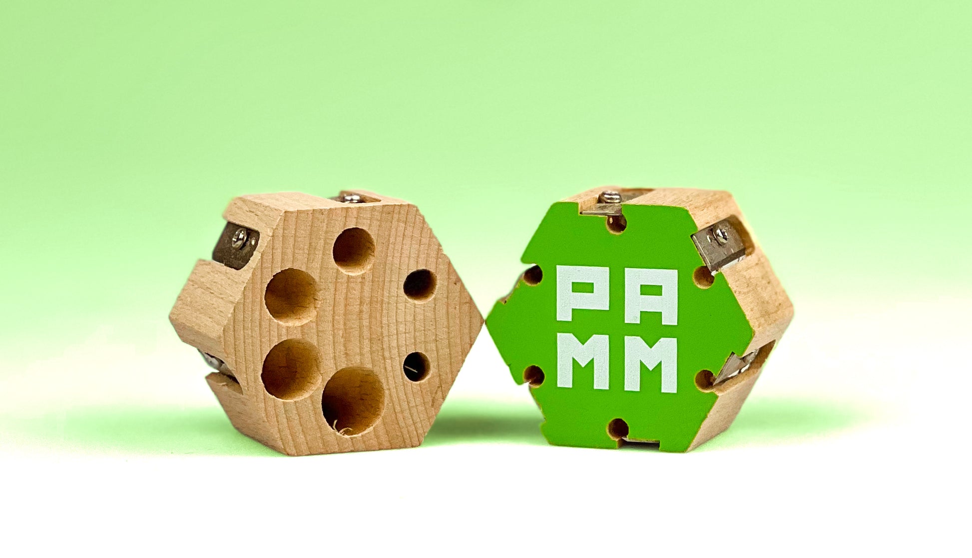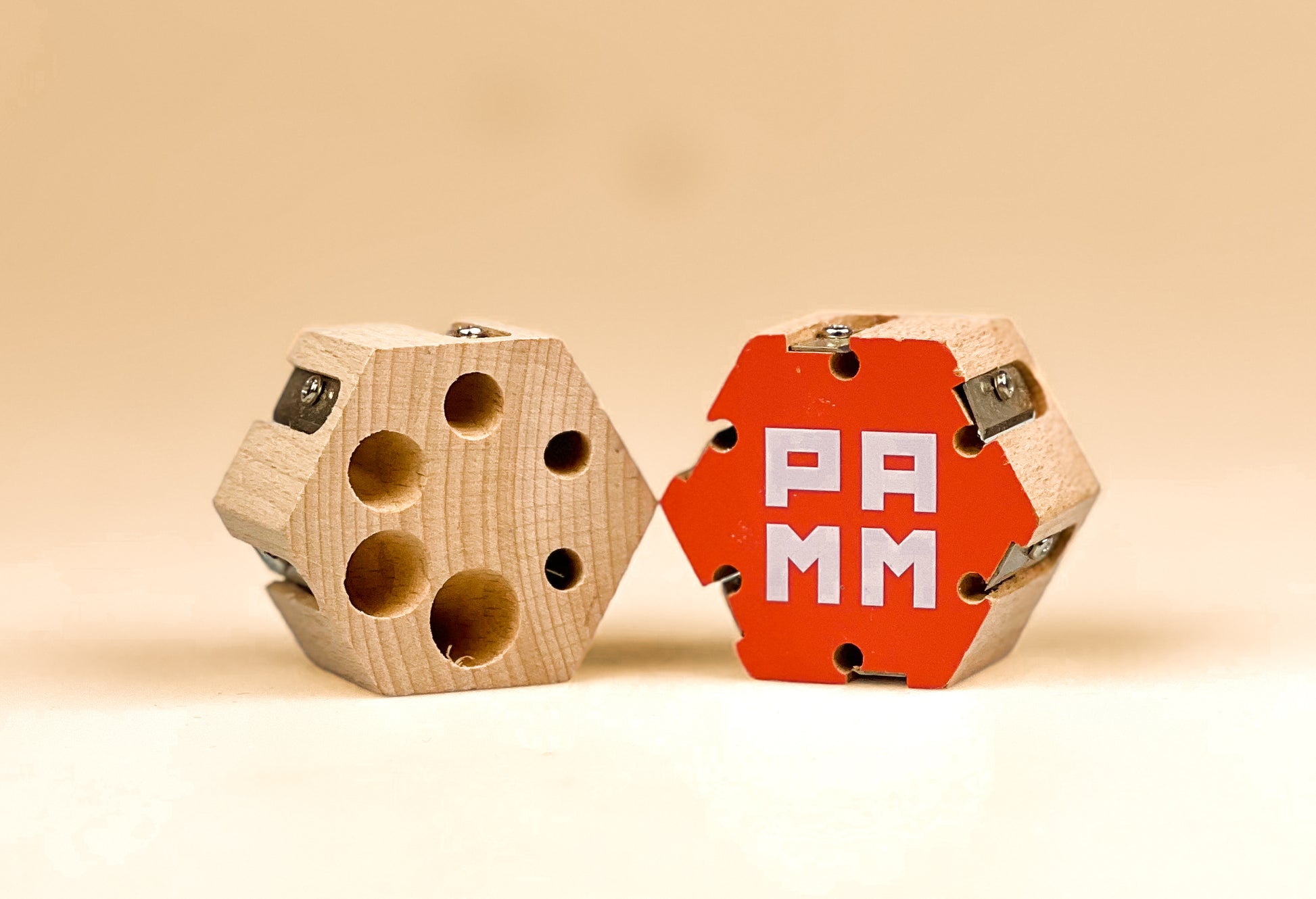 Say hello to the boldest pencil sharpener in the game — the PAMM Hexagon Sharpener, inspired by the creative spirit of Pérez Art Museum Miami! Whether you're sketching, doodling, or writing your next masterpiece, this 6-hole wooden sharpener turns a simple tool into a statement. Crafted with smooth natural wood and topped with bright, eye-catching enamel faces stamped with our iconic PAMM logo, this sharpener isn't just functional — it’s museum-worthy.