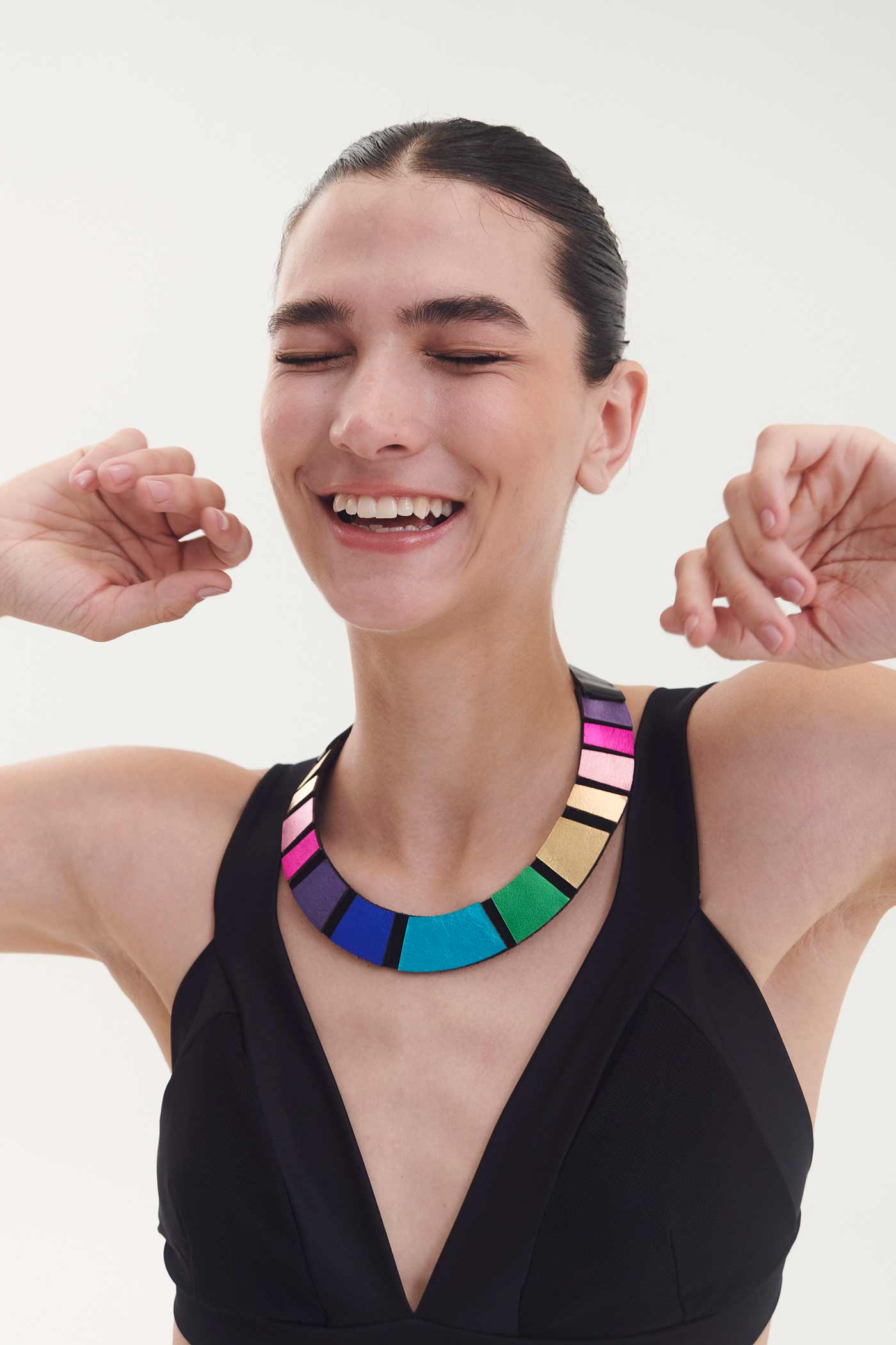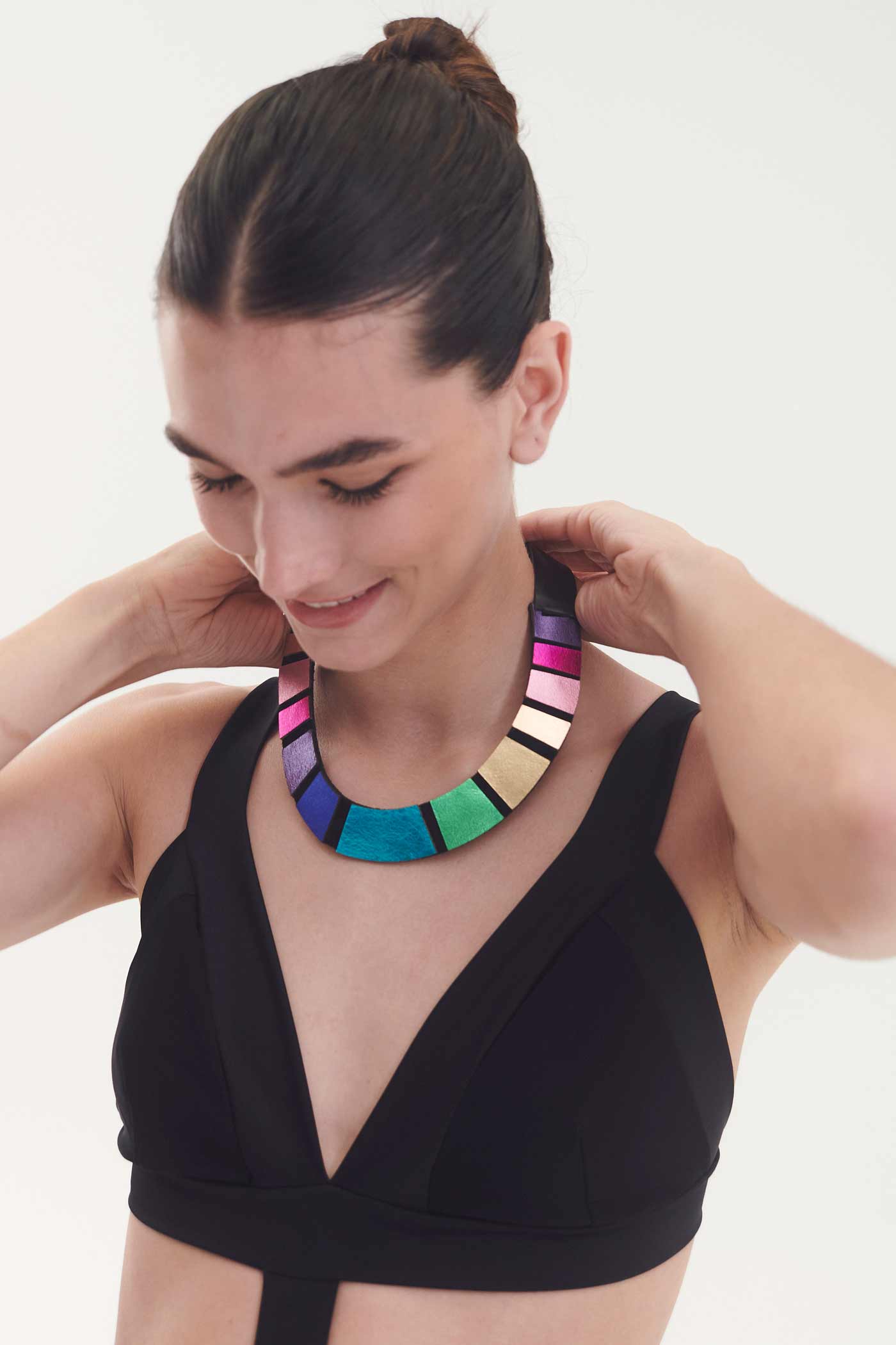 Lightweight shimmer, playful color, and timeless charm—meet the Rainbow Necklace Round. Handcrafted from 100% Argentinian leather and suede, this necklace features dazzling dots that catch the light, radiating joy and attracting compliments wherever you go. Smaller in size than some of its sister designs, it brings just the right amount of sparkle and whimsy to brighten even the gloomiest of days.