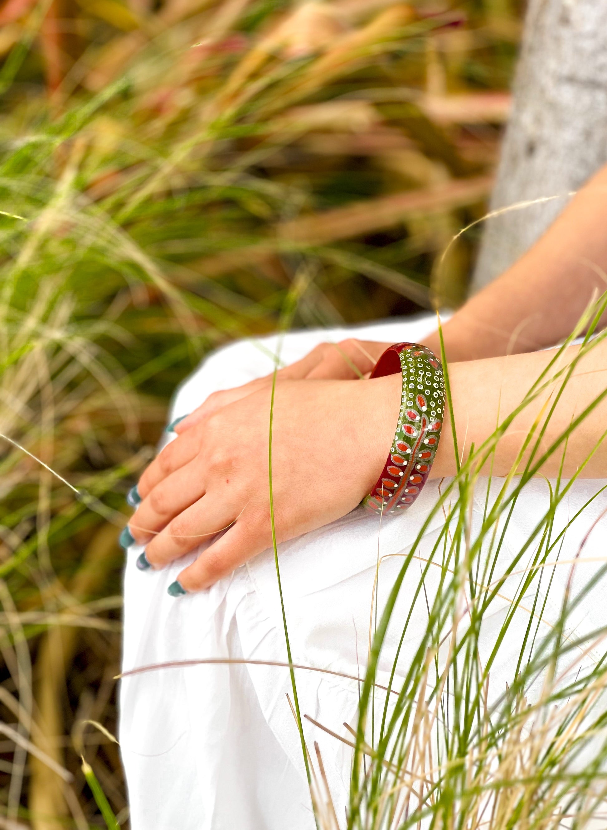 Once the painting is complete, the piece is coated with a layer of clear UV resin. This finish not only protects the delicate artwork from wear and tear but also enhances the colors, giving the jewelry a glossy, glass-like appearance. The resin adds durability and ensures the paint remains intact over time.