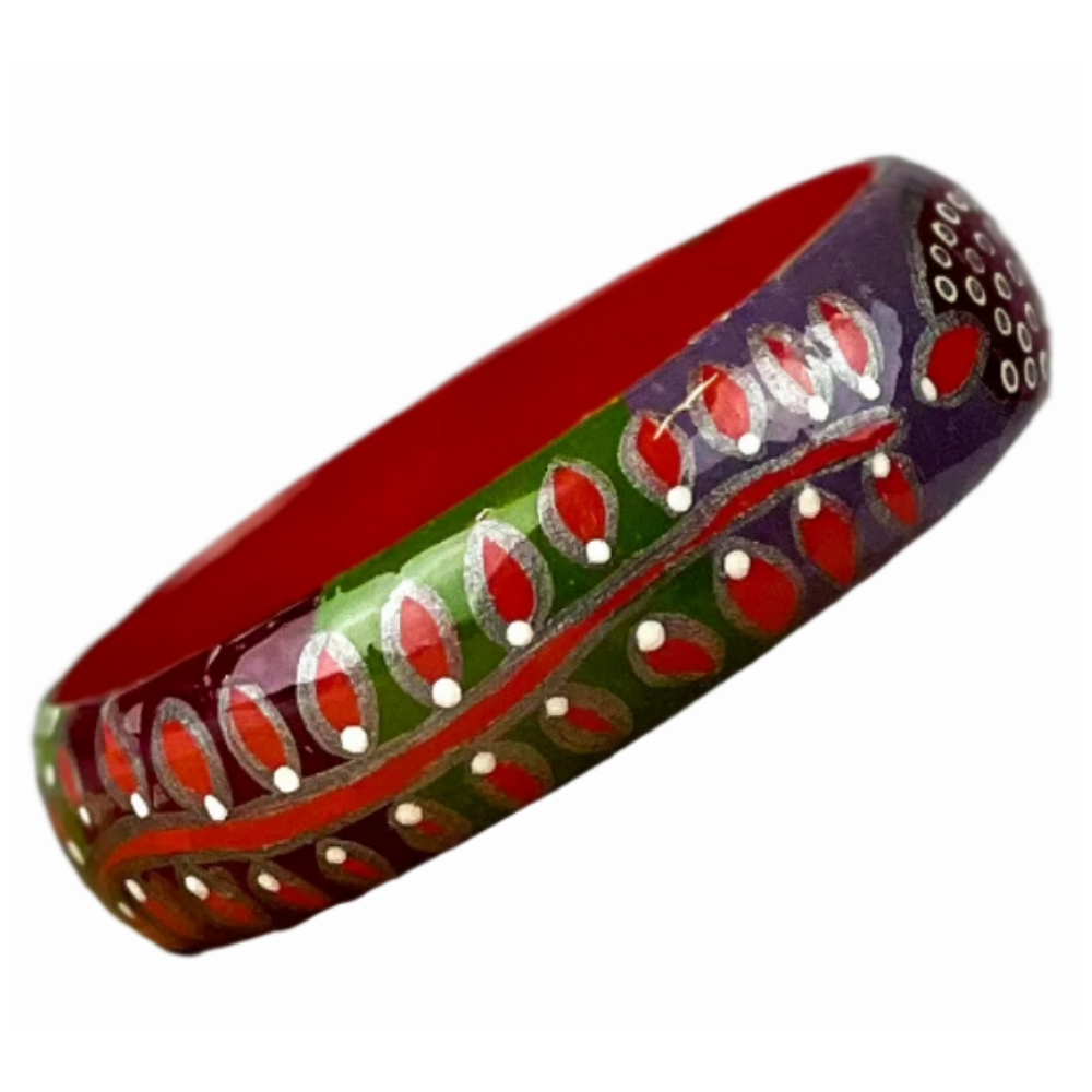 Each piece is crafted from lightweight wood, often carved or cut into various shapes such as pendants, earrings, or bracelets. The natural texture of the wood serves as a warm, organic canvas for the painted designs.