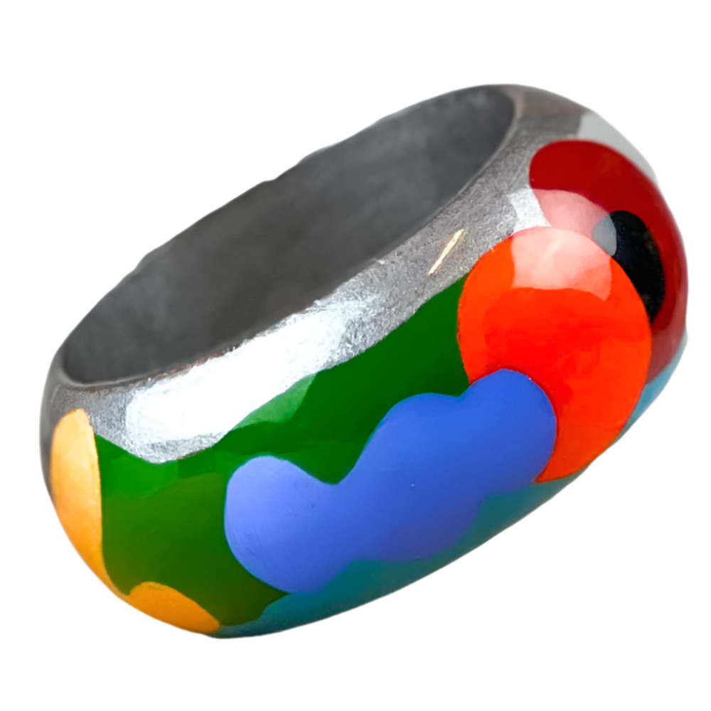 Once the painting is complete, the piece is coated with a layer of clear UV resin. This finish not only protects the delicate artwork from wear and tear but also enhances the colors, giving the jewelry a glossy, glass-like appearance. The resin adds durability and ensures the paint remains intact over time.