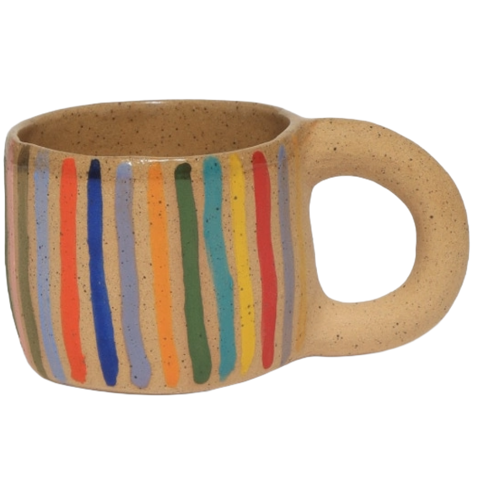 Start your morning with a spark of joy. The Striped Espresso Cup is a playful, handmade mug that adds a touch of color and creativity to your daily coffee ritual. Each cup is hand-thrown and individually painted with a rainbow of vibrant stripes in underglaze — no two are exactly alike. Made from organic, natural stoneware clay, this small but bold cup holds approximately 4 oz, making it perfect for a shot of espresso, a cozy cortado, or a splash of your favorite morning brew. Measuring about 2 inches in height and width (5.1 x 5.1 x 5.1 cm), it sits snugly in your hand with a unique, earthy texture. The interior and lip are finished with a clear food-safe glaze, while the exterior is left raw to let the speckled clay shine through.